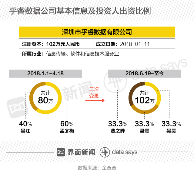 据企查查数据,深圳市乎睿数据有限公司创办于2018年1月1日。创办之初,注册资本80万元人民币,主要投资人为吴江(40%出资比)和孟冬梅(60%出资比)。经过三次变更后,费之晔、聂震和吴昊分占1/3出资额,注册资本共计102万元人民币。