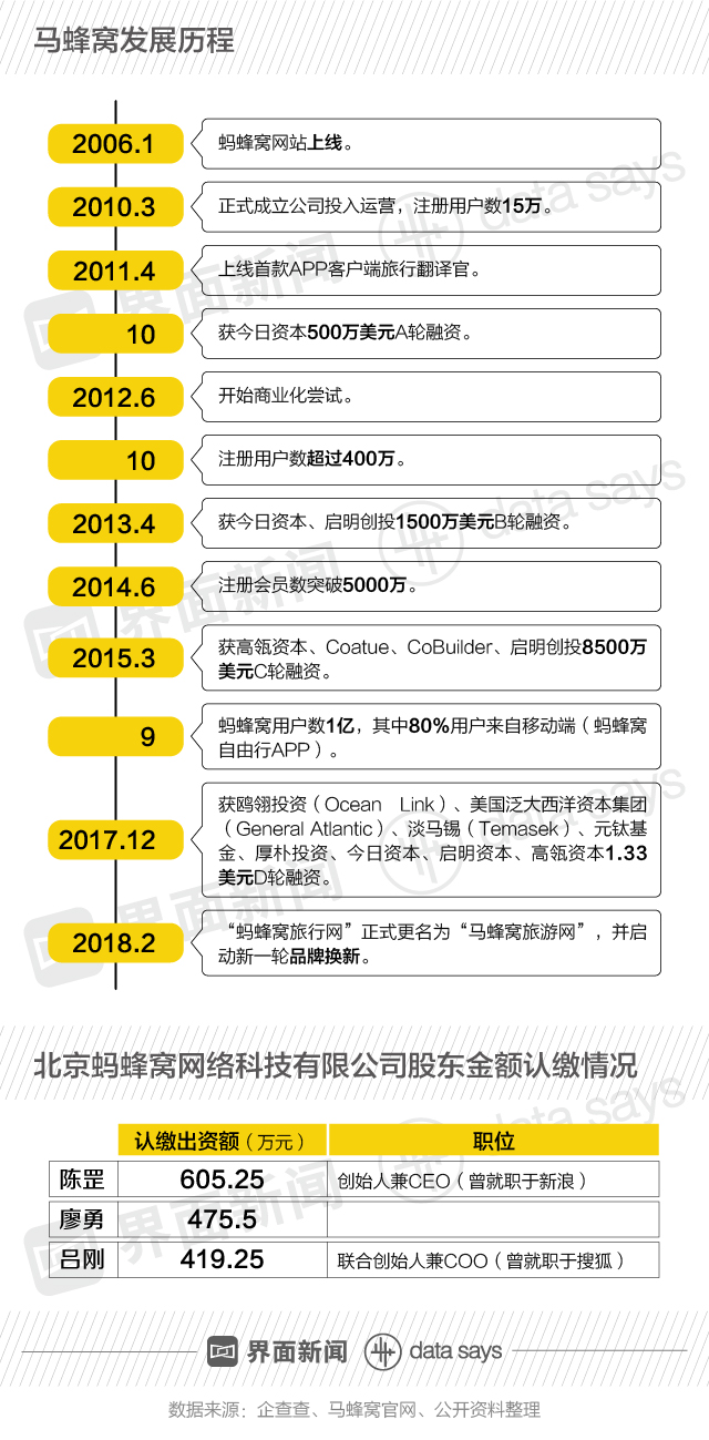 据界面数据(公众号ID:tuli_shuju)公开资料整理,马蜂窝旅行网站创办于2006年1月,2010年3月,正式成立公司投入运营,注册用户数15万。2015年9月,其用户数达到1亿。