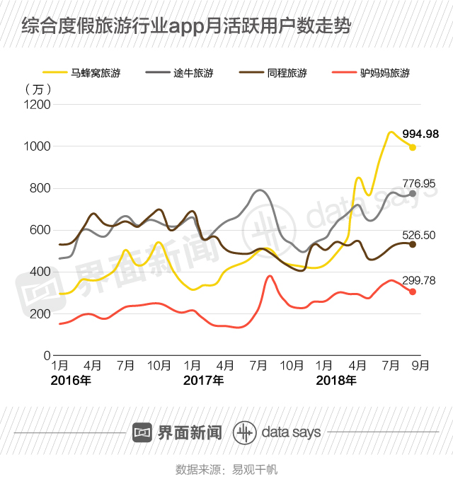 据易观千帆数据,马蜂窝从属于综合度假旅行行业。2018年1月至4月,其活跃用户数增加显著,逐渐成为行业领跑者。截至2018年9月,其月活跃用户数达到 994.98万,远超途牛(776.95万)、同程(526.50万)和驴妈妈(299.78万)。