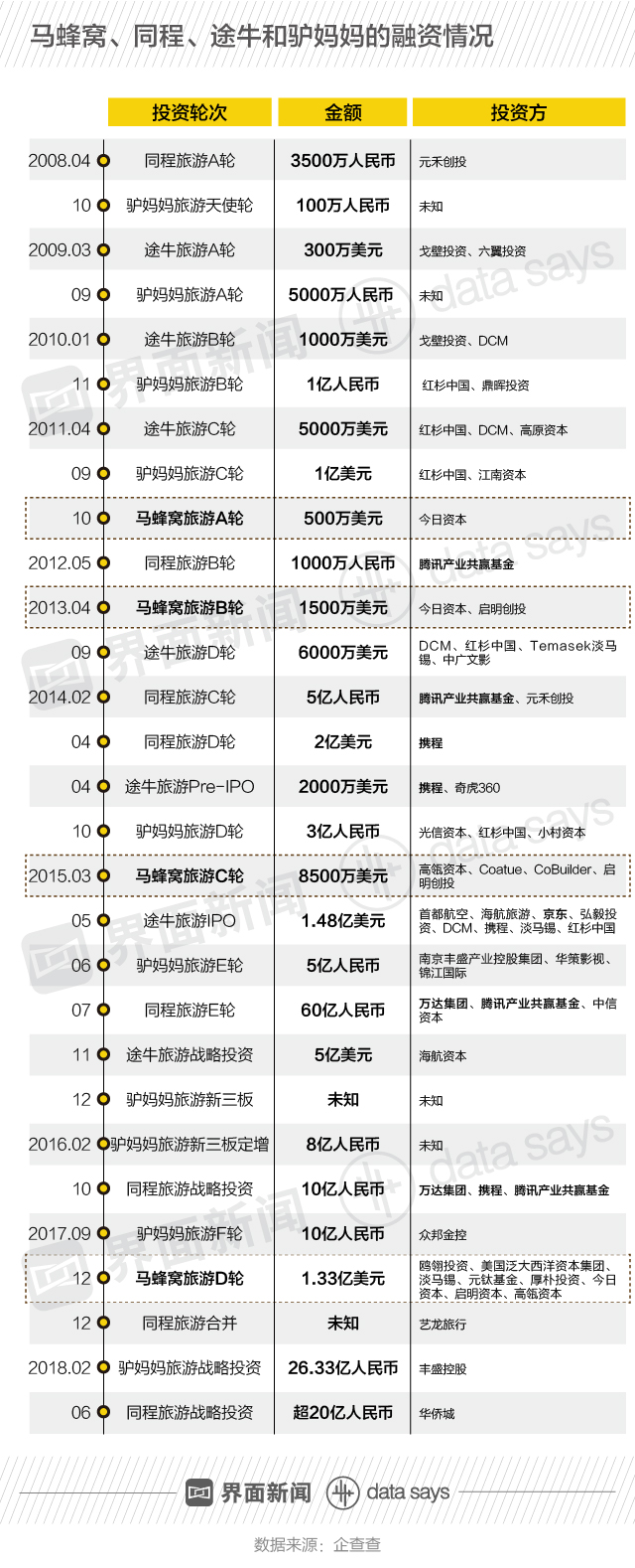 从融资情况来看,2017年12月完成D轮融资的马蜂窝,“脚步”略慢于同程旅游、途牛旅游和驴妈妈。