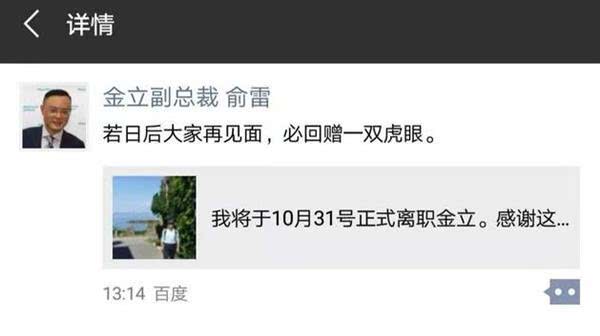 我将于10月31号正式离职金立。感谢这几年来,刘总给我的机会与平台,也感谢同事们以及合作单位、媒体对我的支持。热爱过,努力过,遗憾过。但无悔这几年的付出。我还会继续在高科技行业,为我所热爱的事业,继续超级续航。