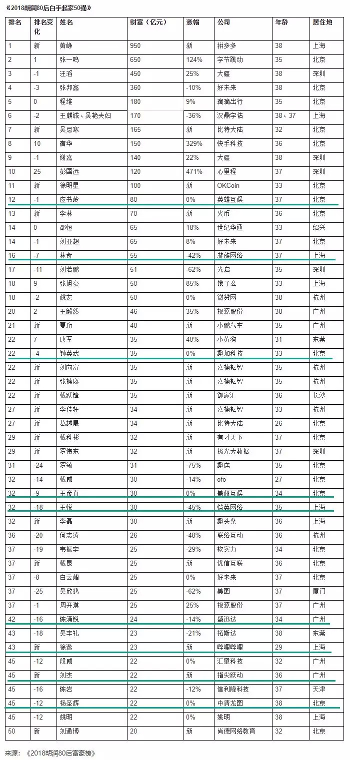值得一提的是,本次上榜的50位白手起家的80后富豪中,来自游戏行业的就有9位,占比为18%,游戏行业也成为了上榜占比最高的行业。下面先来看看完整的榜单(下划线标示为游戏行业上榜富豪):