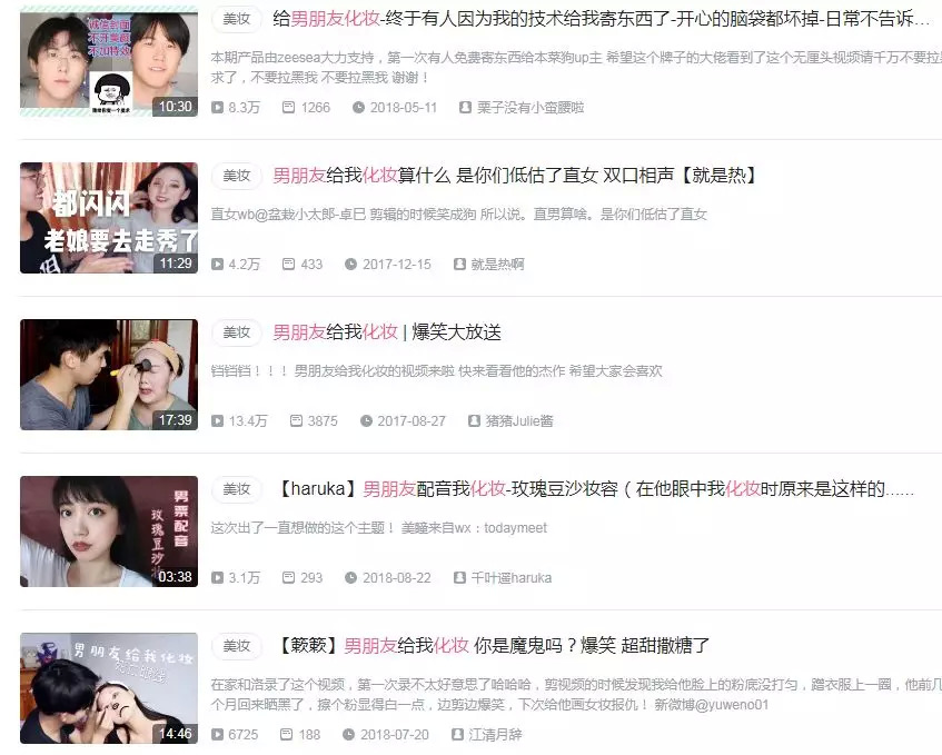 即使不自己动手化妆,男性也能另辟蹊径成为美妆视频的主角。也正是在2016年,“让男朋友猜化妆品”、“让男朋友给自己化妆”的主题视频在网络上一夜爆红,视频中男性对于美妆物品毫无头绪的猜测以及发散思维带来了反差喜剧效果,而网友们也对于男性“不擅长”的探索而感到有趣。男性与女性之间的思维差异成为了大家关注的重点。