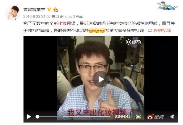 男性化妆这件事情时常不被人理解。2016年,浙江传媒学院播音本科的曾学宁在自己的微博账号上分享了有关男性的化妆小技巧的短视频,却收到了两极分化的评论,有人认为男人化妆是“娘”的表现,而有人认为男性生活的比女性还精致,值得学习。不同群体对于化妆的观点有着明显的区别态度。