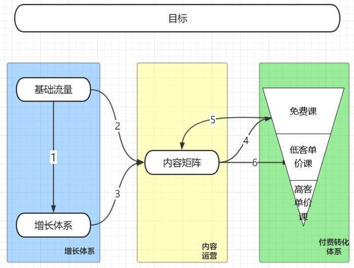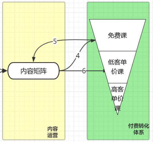 用户从增长体系中进入了微信公众号,而微信公众号从整个运营体系中来看,有2类作用:通过4向付费漏斗的最上层导流;通过6向低客单价课程导流。围绕这2类作用,我展开做一个分析。