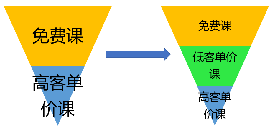 对于大的教育品牌来说,左侧的漏斗行得通,因为品牌本身就给用户建立了信用背书。但是对于初创企业来讲,一定要通过3层,更甚至4层的漏斗来构建信任背书。每一层的课程都是在给用户建立信任背书。
