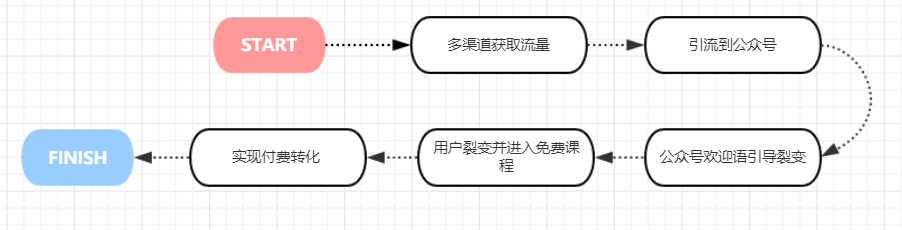这里还要说明一下,为什么还存在5这个箭头,即漏斗最上层导流到公众号?因为,上面一行文字说了,免费课有可能是通过个人号,社群,外部渠道等进入的。所以,这类流量不能浪费需要导流给公众号去沉淀。