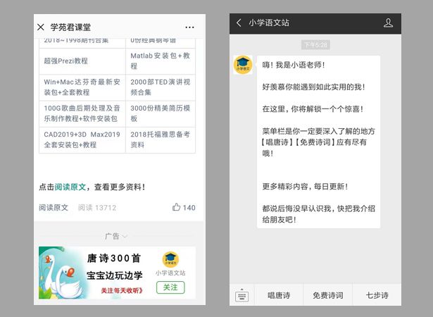 这条路是一条被教育类产品验证可行的玩法。因为课程的收费可以回收广点通的成本。我分享一个之前研究过的产品,名字叫做“小学语文站”。通过截图可以看到,通过广点通投放广告,将流量引流到公众号,公众号的欢迎语是引导用户学习免费诗词。免费诗词虽说是免费,其实就是付费转化漏斗的最上层。后文详细分析。
