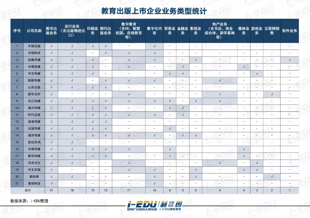 上表整理了教育出版上市企业2017年及2018年上半年公开信息中各公司业务板块的情况。从图中可以看到,除了维持传统的图书期刊的出版、发行业务外,不少上市.企业将新业务的开发重点放在了数字教育和数字化内容两个方面。