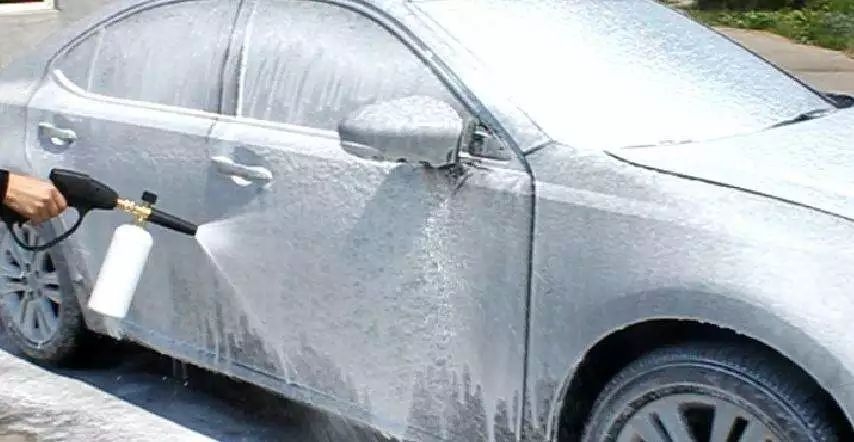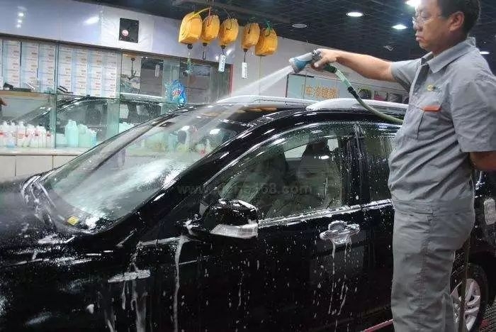 高压水枪冲洗干净车身之后接下来该给车上液了,将洗车液均匀的泼洒在车身之上,然后用洗车海绵将车上的洗车液在车身上擦拭一遍,然后使用高压水枪将车冲洗干净。