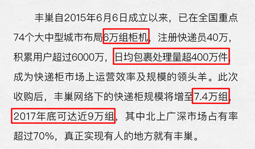 一个月后,中邮资本、复星集团、菜鸟网络三家公司参与了速递易的重组,虽然速递易重组计划在去年4月份就已有计划,但最后菜鸟以及亲阿里的复星参与其中,更多的目的是拉拢速递易成为体系盟友,以便牵制丰巢的发展。
