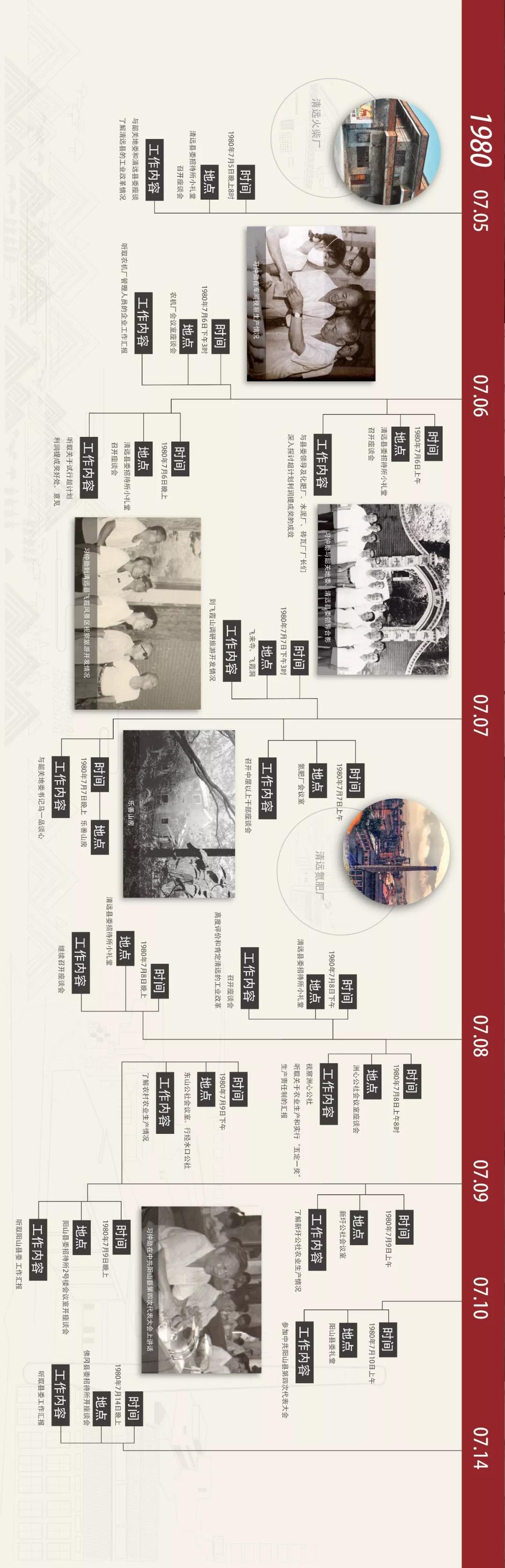 1980年7月6日,继续在清远县委招待所小礼堂召开座谈会,除了省、地区、县的领导外,还请县经委、财委、财政局等单位和化肥厂、水泥厂、砖瓦厂等基层与企业领导参加。会上,继续听取关于清远县地方国营工业企业试行超计划利润提成奖的汇报和清远县委其他负责人的补充汇报,然后听取化肥厂、水泥厂、砖瓦厂等的汇报。整个上午,习仲勋除了时而插话提问外,都是在认真细致地听,认真地记。