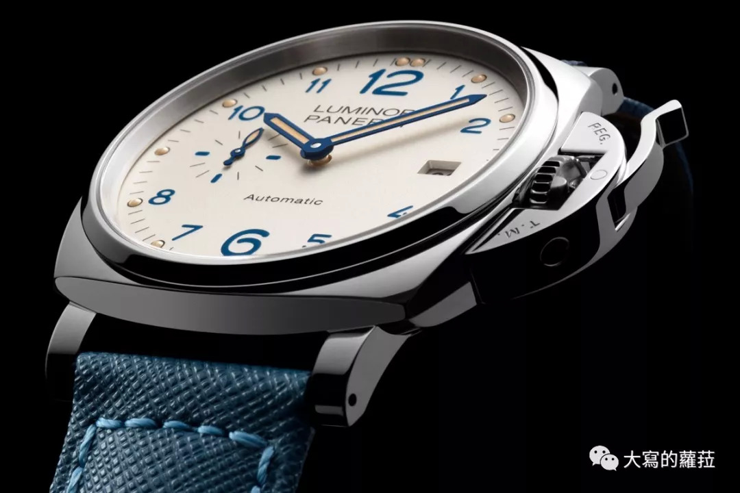 而另一款白面全数字时标款的PAM906,我倒觉得可能不是所有的人都会喜爱,但我却独衷这样的面盘设计,原因在于:选择沛纳海同中求异的众多款式时,我会选择第一面盘特殊且少有的,第二才选择偏好机芯,PAM906这种大大小小12个阿拉伯数字组成的面盘,目前在沛纳海的所有款式里大概就不超过8款,而且这一款搭配的又是少有搭配天蓝色缝线、皮革表带的款式,不过纠结的点又来了:这款虽然是可爱又少见的蓝色时标,却不是三明治面盘设计,且夜光显示也是特殊的圆点标示,是特别却也不适合纠结偏爱三明治面盘的朋友们。
