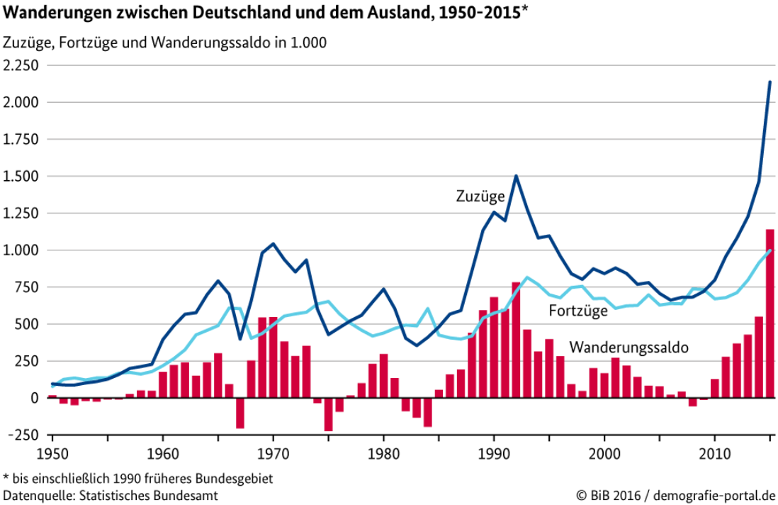 这一时期的移民潮延续了二十年之久,被认为是德国政府针对老龄化社会做出的反应。德国自1980年代起人口就开始萎缩,尤其是20岁以下年轻人的迅速减少带来了养老金开支的巨大隐患,稀缺的年轻劳动力还给对成本敏感的低端服务业造成了巨大冲击。尽管无法逆转老龄化的趋势,但是第三次移民潮的确扭转了年轻人口下降的趋势。1990年到2000年的十年中,德国再次迎来了年轻人口的正增长,而上一次1960年代时期的年轻人口增加也是归功于第二次移民潮中赴德的年轻客籍工人。