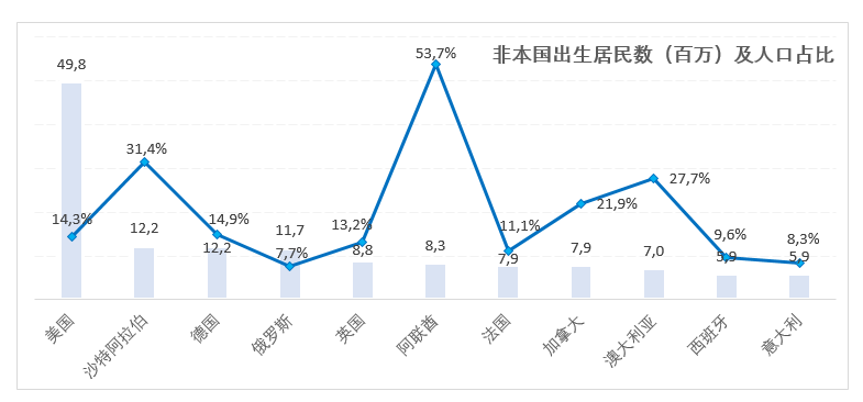 一直以来,德国的法案从起草到生效往往都需要很久。而这次新移民法的出台之所以如此紧锣密鼓,与德国的劳动力缺口不无关系。尽管默克尔早在2001年就宣称德国并非移民国家,将来也不会是,其所在政党基民盟也在之后的几年多次重申这一基调,然而,移民一直在德国社会扮演着极其重要的角色。尤其是2010年后,基民盟对于“非移民国家”的定性逐渐软化,2015年,默克尔正式对媒体宣布:“德国是一个移民国家”。这之后的2016年,德国就签发了105万份永久居留,是全球第二大移民净流入国,仅次于传统移民大国美国的118万份,远高于其它欧洲移民大国英国(35万)和法国(26万)。如果算上给予难民的临时居留,这个数字则达到了惊人的185万。截止2017年底,德国境内生活着1220万非本国出生居民,占总人口的14.5%。这个数字仅次于美国的4980万,排名发达国家第二,远高于传统意义上的移民国家,如英国(880万)、法国(790万)、加拿大(790万)和澳大利亚(700万)等。对比之下,一直以来同样被认为是非移民国家的日本,非本国出生居民仅为204万,占总人口不到2%。