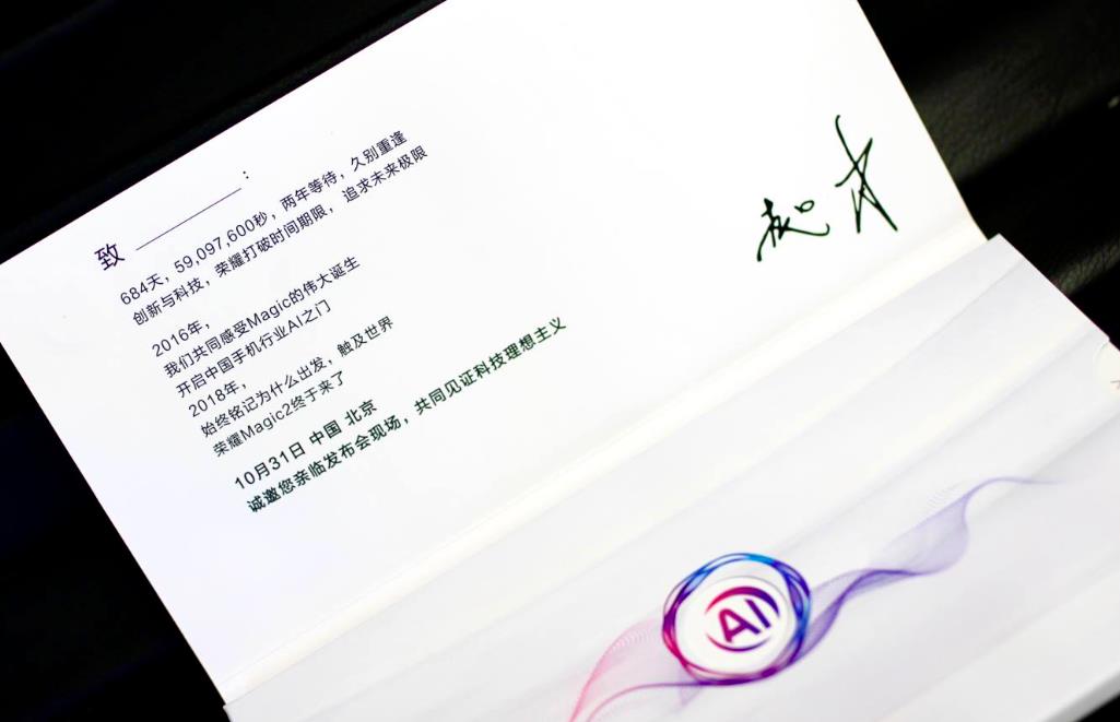 除了人工智能,荣耀Magic 2邀请函上还写着“两年等待,久别重逢,创新与科技,荣耀打破时间期限,追求未来极限”等字样。