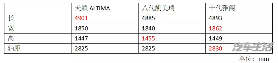 从申报信息来看,天籁ALTIMA的长宽高分别为4901/1850/1447mm,轴距为2825mm,比现款在长和宽上分别增加10mm和20mm,高度降低43mm,轴距增加50mm。将天籁、凯美瑞、雅阁的车身数据放到一块对比,三者其实各有所长。天籁ALTIMA的特点是车身将更显修长,同时车身重心也更低。