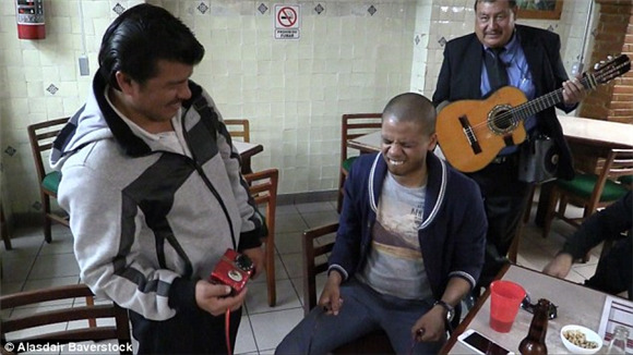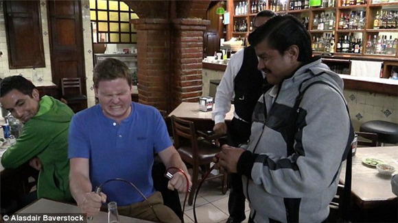 “如果达到你能承受的电压上限时,你会感到大脑的刺痛感,”Ignacio Alonso说。他在承受90伏电压后尖叫求饶,接下来他必须接受惩罚,喝下好几杯mescal,一种类似于龙舌兰酒的烈酒。