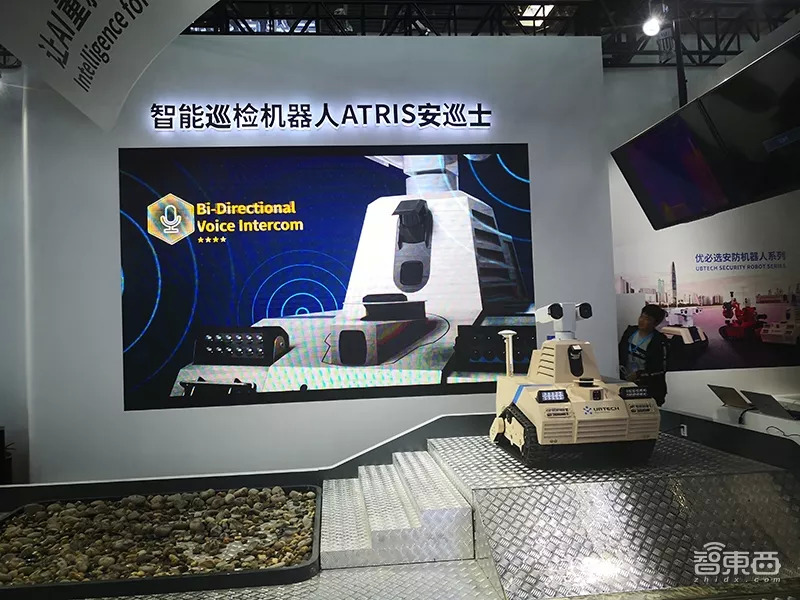 优必选一共展出了四款产品,其中智能巡检机器人ATRIS是优必选在本次安博会中重点展示的产品,具有全地形、自主导航、强声驱散等功能。
