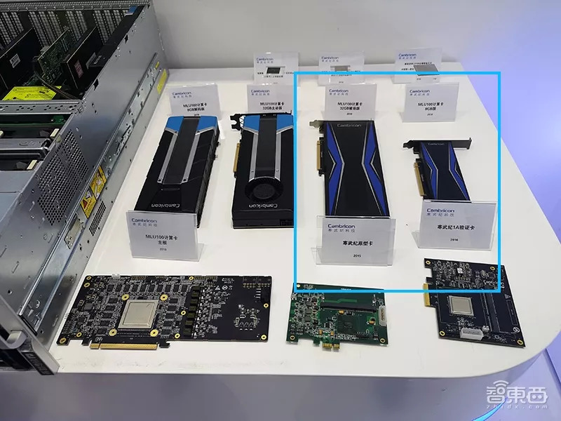 两款基于MLU100云端AI芯片打造的新计算卡(图中蓝框),与上代相比优化了散热性能,在板卡上取消了散热风扇。据寒武纪工作人员介绍,右边的8GB版计算卡比左边的32GB版减少了视频编解码模块,可应用于AI语音语义场景。
