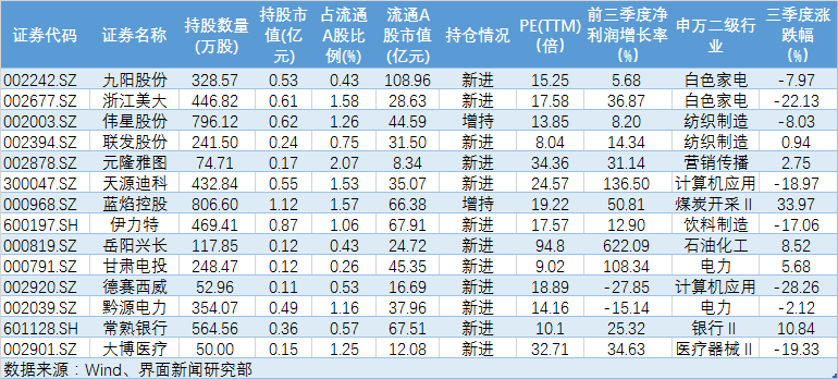 与此同时,养老金又部分参照了社保基金的选股思路,三季度,九阳股份(002242.SZ)、浙江美大(002677.SZ)、伟星股份、蓝焰控股、黔源电力(002039.SZ)、常熟银行(601128.SH)等六只个股被养老金和社保基金同时“相中”。