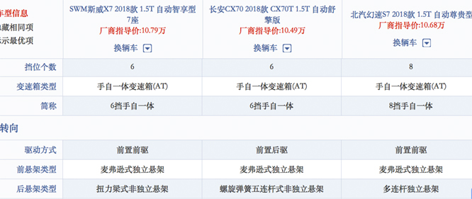 在变速器方面,定价10万元左右的长安CX70、斯威X7和幻速S7自动挡车型分别匹配6AT、6AT和8AT变速器,幻速S7的变速器档位最多换挡更平顺。不过,长安CX70的6AT来自爱信,其稳定性也很出色。此外,在10万元以内,三款车都有配备6MT手动变速器车型,就10万元预算来说,能买自动挡的情况下比买手动挡开起来更省事。