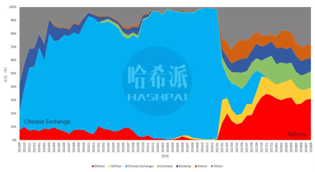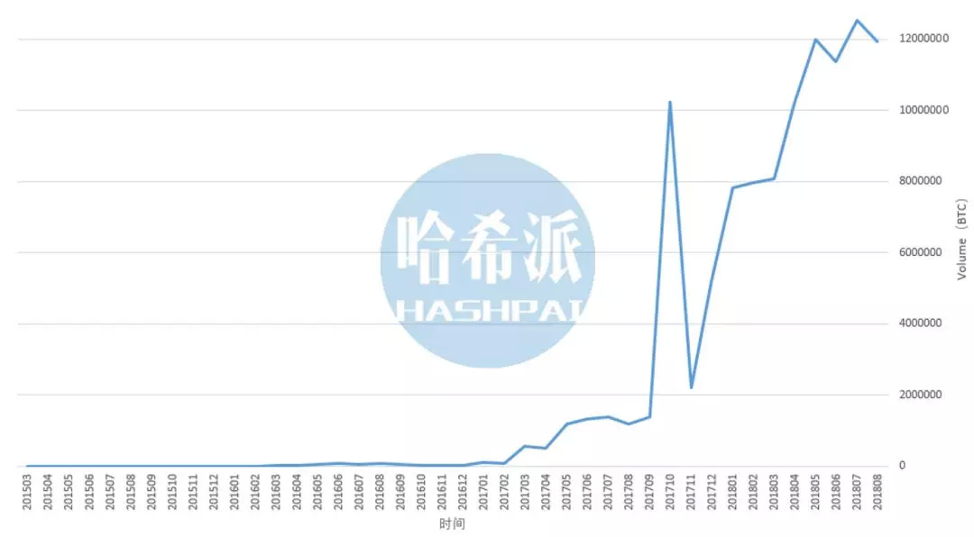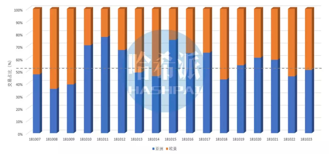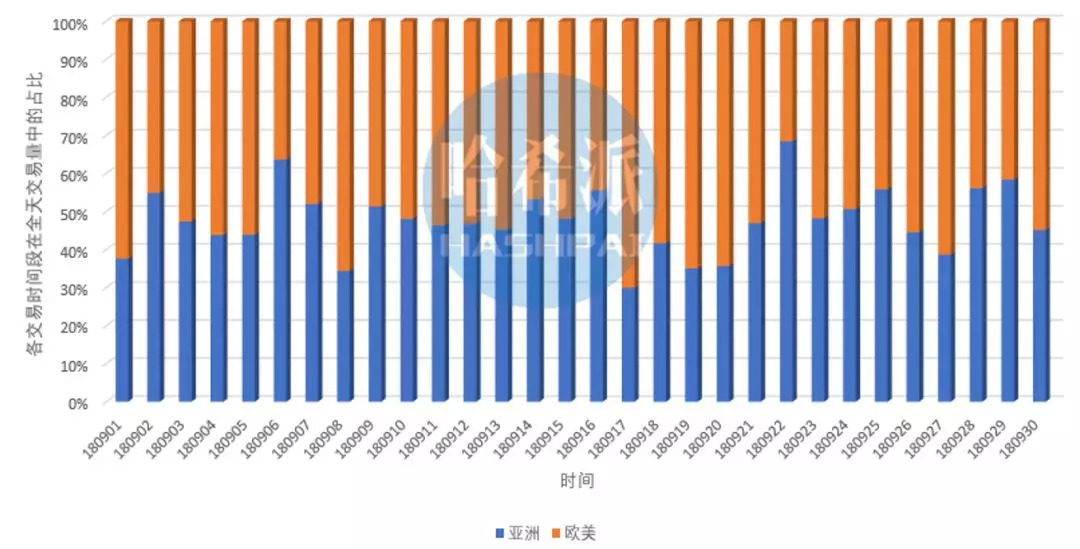 不过在中国等地区投资者缺乏法币交易途径的市场情况下,以USDT为首的稳定币市场开始兴起。截自2018年9月底,BTC/USDT在全球比特币交易量中的占比已超50%,而上线该交易对的平台分散于世界各地;所以说仅仅靠表面数据难以判断各地区投资者的具体参与情况。为了更全面地了解市场实况,哈希派(公众号ID:hashpai)对数据进一步深挖,发现了隐藏在数据面下的有趣信息。