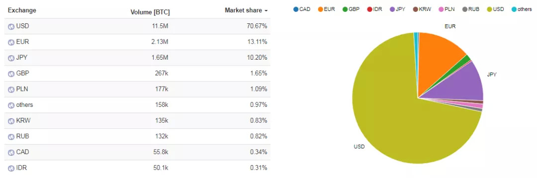 根据外网data.bitcoinity.org的数据显示,近半年时间里法币兑比特币交易集中在美元及欧元区,两者分别占据总交易量约71%和13%的份额。而对比特币等加密货币态度相对积极的日本,在去年承认比特币合法支付地位之后,交易量占比从不到1%上涨至如今的10%左右,当前位列全球第三。