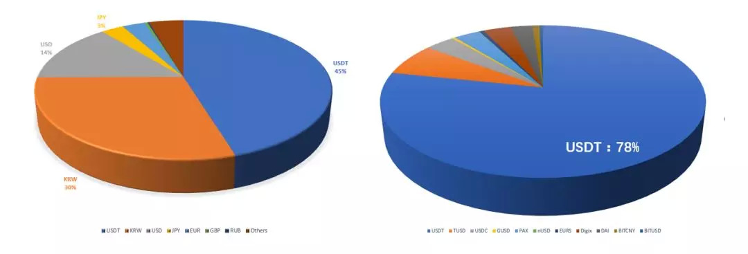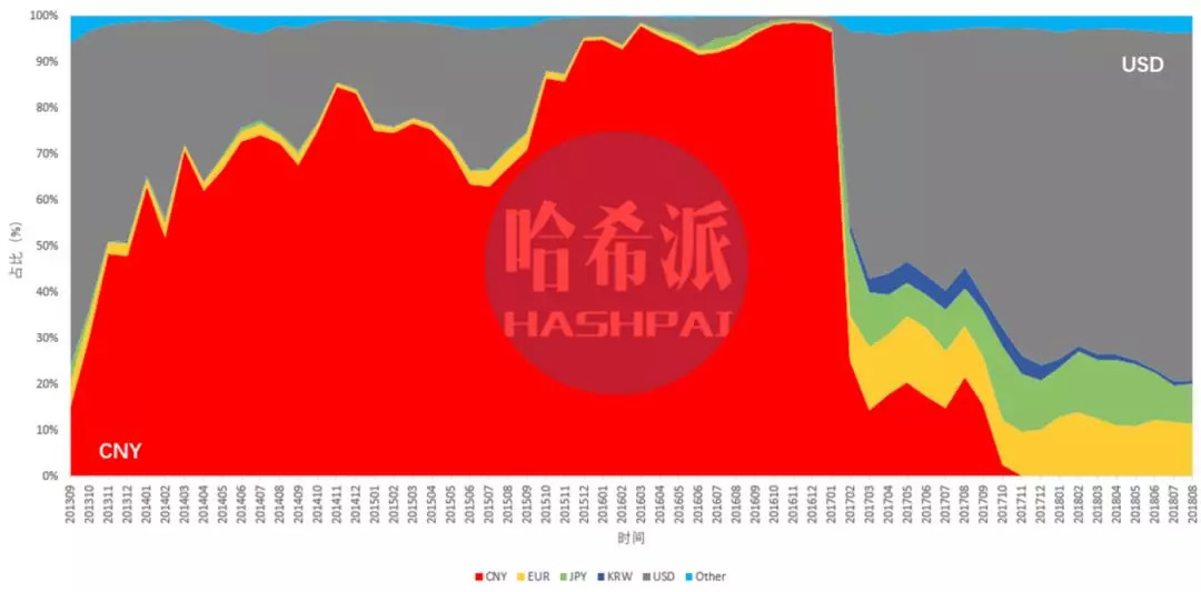 至于2014年开始便长期称霸比特币市场的人民币交易对,则在政府趋严的监管下,逐渐淡出市场——从2017年年初监管部门相继约谈三大交易所负责人到九月份当局颁布加密货币相关禁令,BTC/CNY在全球市场的占比由近98%一路下滑至当前的0.05%以下。