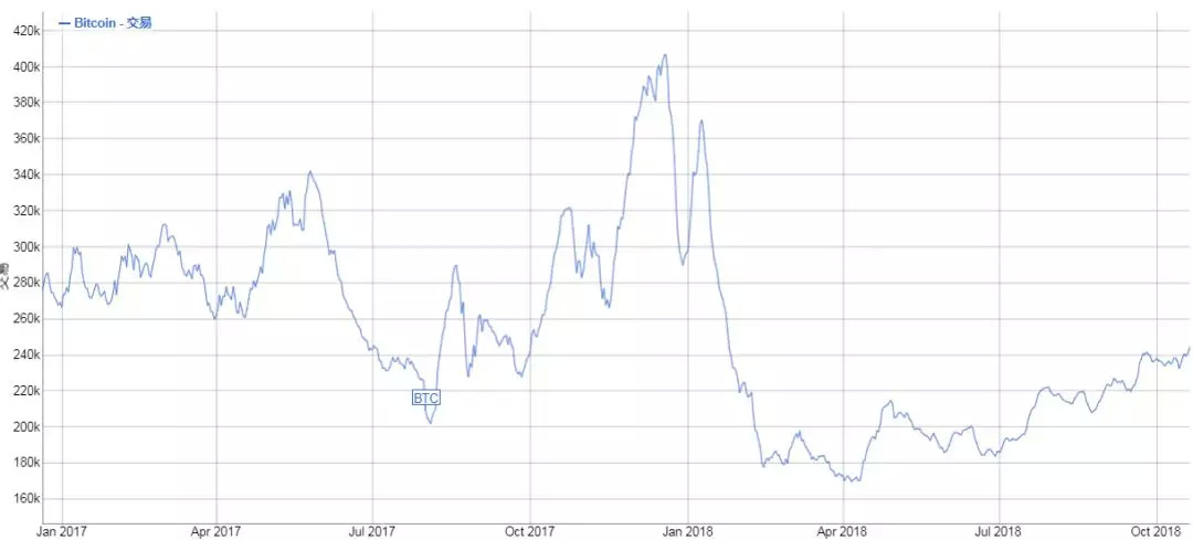 比特币日交易数量(数据源自: bitinfocharts.com)