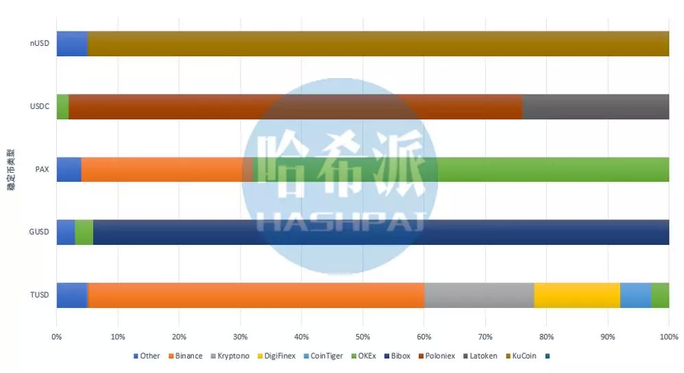 此外趁着USDT信用危机市场规模逐渐扩大的其他稳定币种市场内,绝大部分交易量亦由中国投资者贡献。比如当前总供应量最高的稳定币(除USDT外)TUSD和PAX,它们与比特币的交易对在“中国交易所”的交易量占比较高。如果以最近几日的交易情况及上述分析再次进行估算的话,目前中国投资者在市场上的参与率依旧高于30%。