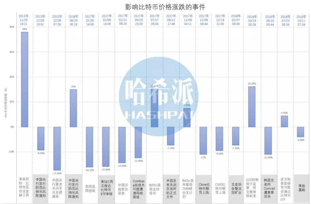 与此同时,中国地区新闻对比特币价格的影响力也明显下降。如下图所示,2013年到2017年间影响比特币价格涨跌较大的事件发生在中国居多;但“币圈九四事件”发生之后,这种趋势就逐渐往美国地区转移,比如十月第二周出现的大幅下滑与美股暴跌有关,而七月下旬的价格上涨则受SEC是否通过比特币ETF影响。