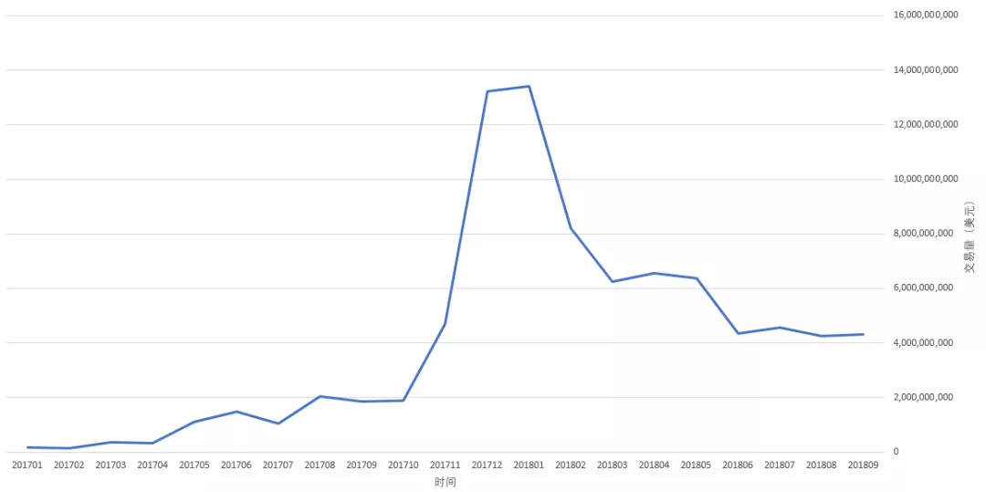 比特币日均交易量(以月为单位);数据源自:coinmarketcap.com