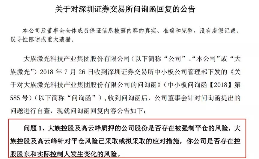 但公司表示“不存在被强制平仓的风险,截至2018年8月2日,公司股票收盘价格为43.91元/股,在大族控股及高云峰的预警线及补仓线上,……,公司实际控制人不会发生变更”。