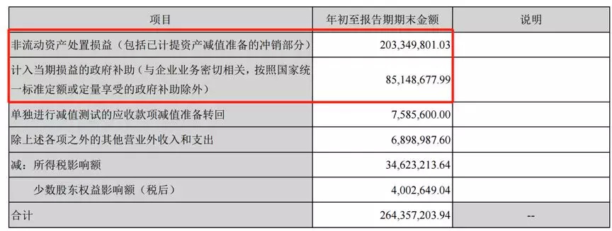 在2.64亿的非经常性损益中,约有2.03亿来自非流动资产处置损益,另有约8514.87万元来自于报告期内的政府补助。