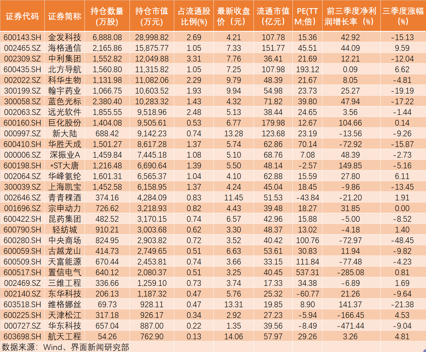 三季度,A股走势依旧低迷,证金公司在此期间进行了系列调仓换股操作。界面新闻梳理发现,截至当前,证金在A股市场中挖掘出29只“新宠”,这其中,金发科技(600143.SH)、海格通信(002465.SZ)、中利集团(002309.SZ)三只个股获持仓市值居前,分别为2.90亿元、1.59亿元、1.20亿元。