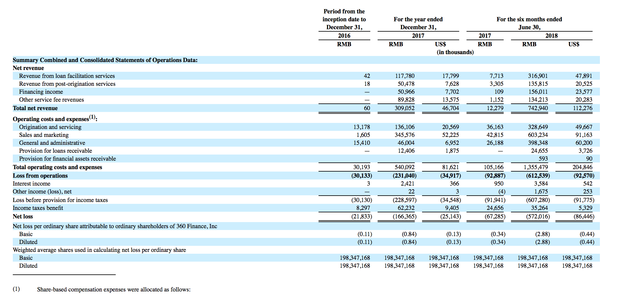 招股书显示,2017年净收入3.091亿元,截至2018年6月30日的六个月里,公司净收入为7.43亿元,2017年同期净收入为1230万元,同比涨幅5940.65%;此外,2018年前三季度净收入约为14亿元人民币。根据财务数据,360金融的主要收入来自撮合贷款服务费和贷后服务费。