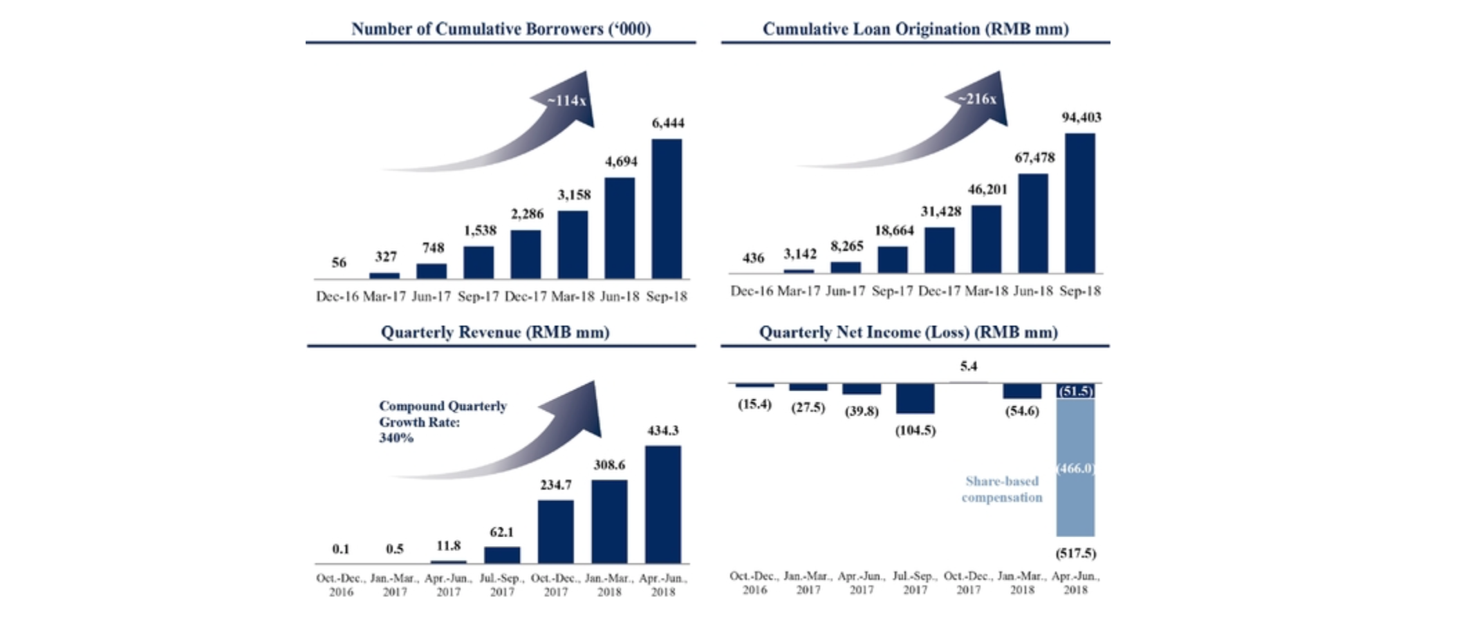 自2016年7月到2018年9月30日,通过360金融的服务获得贷款的用户累计640万、360金融累计促成的贷款总额944亿元人民币、贷款余额347亿元人民币(52亿美元),M3+拖欠率为0.6%,不良率为0.2%。未偿付贷款余额为347亿元(52亿美元),从2016年四季度以来的单季复合增长率分别为97%、115.6%和95.2%。