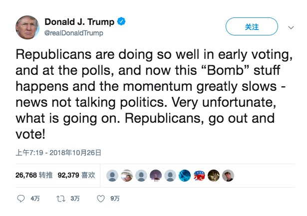 此前特朗普曾在推特上暗示媒体的报道将公众注意力从中期选举上转移开来,目前应是共和党人往前迈一大步的好时机。“共和党人在前期的投票、民调还有这次的‘炸弹’事件上都做得很好,但这个势头也大幅减慢——新闻不再谈论政治。很不幸,这正在发生。共和党人,走出家门投票!”