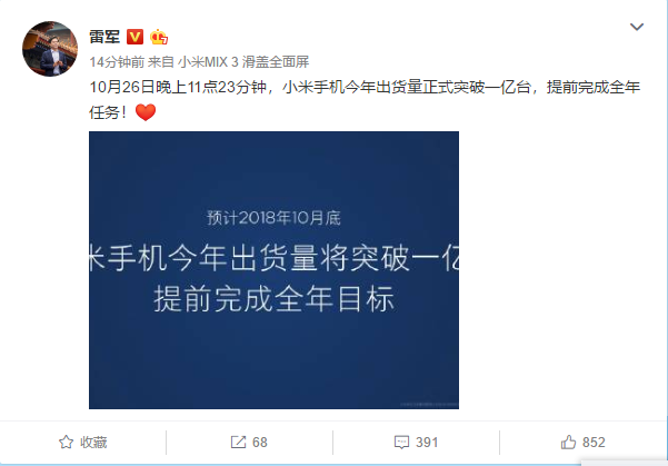 雷军宣布,10月26日晚上11点23分钟,小米手机今年出货量正式突破一亿台,提前完成全年任务。