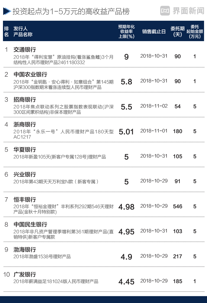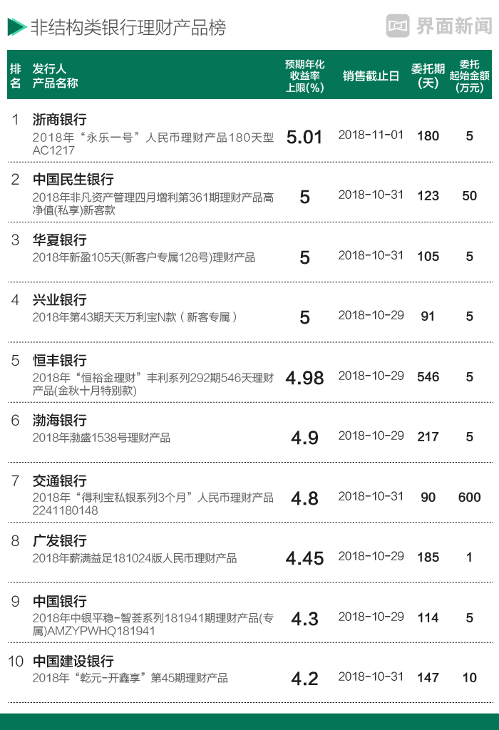 考虑到投资者的拟投资金额、风险偏好不同,本期还对起点为1至5万元的银行理财产品以及抛去结构化产品收益复杂设置、收益相对稳定的非结构类理财产品进行筛选,做成榜单,供投资者参考。