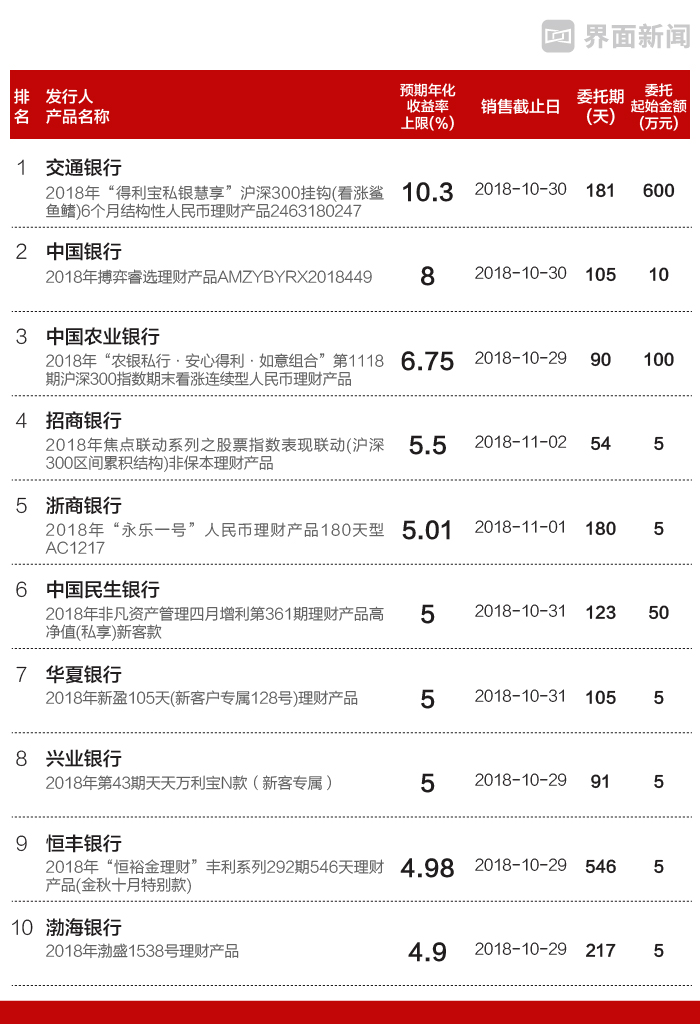 来看看本周有哪些可以挑选的银行理财产品。本周,18家国有商业银行和股份制商业银行全国范围在售针对个人的人民币理财产品162只,其中未包含结构性存款银行理财。界面新闻从每家筛选了收益率最高、最值得关注的理财产品,共10只。