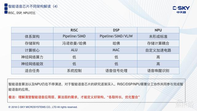 另外还有一家是北京的云知声。云知声最近也一直在做市场的推广,让更多的人知道他有一颗“雨燕”芯片,里面也是由一个CPU+DSP+自定义的NPU的架构。因此,从2018年开始,有更多企业开始认真地深入地去思考智能语音。这也就是前面我讲到的那几个点,由于它里面会涉及到人工智能的一些算法,而NPU被引入进来弥补CPU或者DSP在神经网络计算方面算力不足和能效比较低的缺点,我相信这也会逐渐成为未来的趋势。其实NPU技术在图像类和视觉类很早就已经被应用起来了,但是应用在智能语音是2018年才起来。