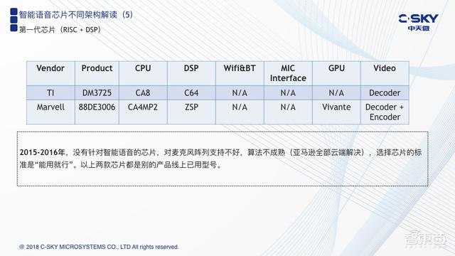 智能语音芯片,从产品的出现到现在,我认为可以分为三代:第一代要追溯到2015年,也就是Amazon刚发布Echo以及Google刚发布Google Home时用的芯片,上图中也罗列出来了,包括TI多媒体处理器以及Marvell的一款处理器,基本上是CPU搭配DSP的架构。CPU一般是ARM Cortex A系列的产品。而对于DSP来说,由于TI在DSP上有非常深的积累,它会把自己C64系列的DSP放在里面,而Marvell当时用的应该是芯原的ZSP系列。同时,它们都没有集成WI-FI和蓝牙;从麦克风接口的角度来说,当时也不具备。另外,由于它们之前都是用在多媒体应用领域,所以里面有GPU硬件单元。回顾那个时代,当时是没有一颗真正针对智能语音的芯片,主要是因为当时这个东西很新,很多技术都是不成熟和不完善的,很多问题大家都没有彻底地去理解,因此拿一颗在以往的产品上已经被成熟应用的芯片直接过来做相应的开发。我认为,当时选择芯片的标准就是能用就行,只要能够把它想要跑的一些应用软件程序都能跑起来,就可以了。