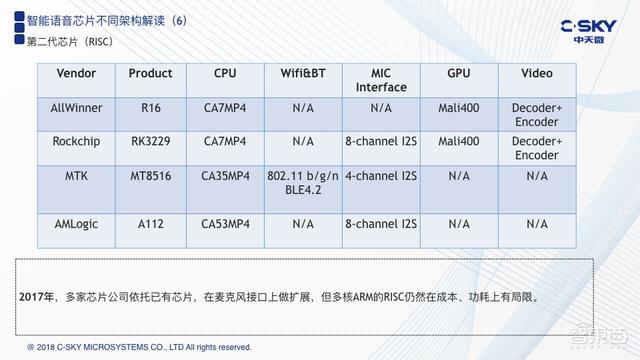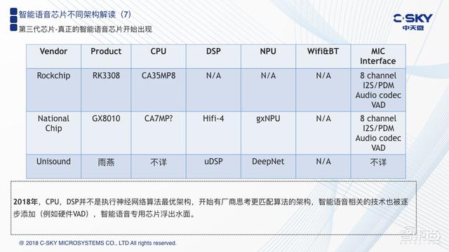 目前来说,上图列出的是目前已知的三款,第一款是瑞芯微的RK3308。相比第二代芯片,RK3308加入了一个新的功能,就是语音检测VAD,是用纯硬件的方式去实现的,技术点在智能语音交互当中是非常关键,特别是对于低功耗待机情况下的语音监听是非常重要的特点。