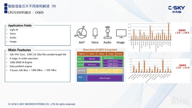 最右边的两张图是做了非常直观的对比,上面一张图是一些通用的DSP计算函数效率的对比,实际的测试结果已经是我们友商的3倍到24倍;下面这张图更多的是聚焦在神经网络相关的一些基本函数的执行效率上,也可以看到已经达到了友商的2.8倍-21.6倍,即CK805的核目前已经能够去取代一些重量级的DSP。相对于普通RISC架构的MCU核,它的算力已经有了非常大的提升,同时这个核也是智能语音平台的基础所在。
