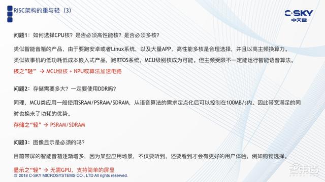 对于第一个问题,类似于智能音箱产品,我称之为是比较重一点的产品,由于要跑安卓或者Linux操作系统,以及大量APP,选择高性能多核是合理的,并且可以以高频换算力的方式去满足神经网络的需求。类似于故事机的低功耗低成本嵌入式产品,一般跑的是实时RTOS操作系统,而本身用的处理器是MCU级别的处理器,在这个核的基础上去升级智能语音是有可能的。但是,它的主频比较低,且强调低功耗,我认为 MCU级别的核配上NPU或者是一些专门的算法加速电路,就能提供核心性能。