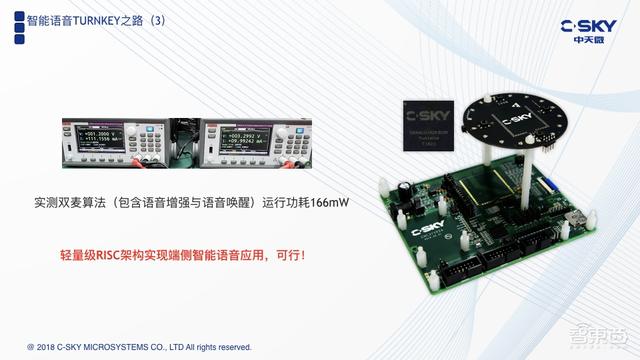 最后这张图是实际成果的展示。现阶段我们也能提供一套完整的开发套件给大家,包含芯片以及麦克风模组等整个开发的平台。同时,我们也非常有勇气展示给大家我们实验室中实测的数据。这是在跑双麦算法时,它实际的运行功耗是166毫瓦。通过这些,我们想要证明利用轻量级的RISC架构实现端测的智能语音应用是完全可行的。