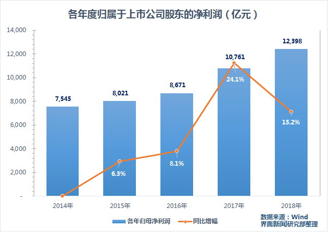 从更长期的角度看,以拥有完整2014至2018年同期数据的2094家上市公司为基准,可以看到今年的业绩增长处于历年高位,远超2015年及2016年分别6.3%及8.1%的同比增速,上市公司业绩在近两年有着爆发式的增长。