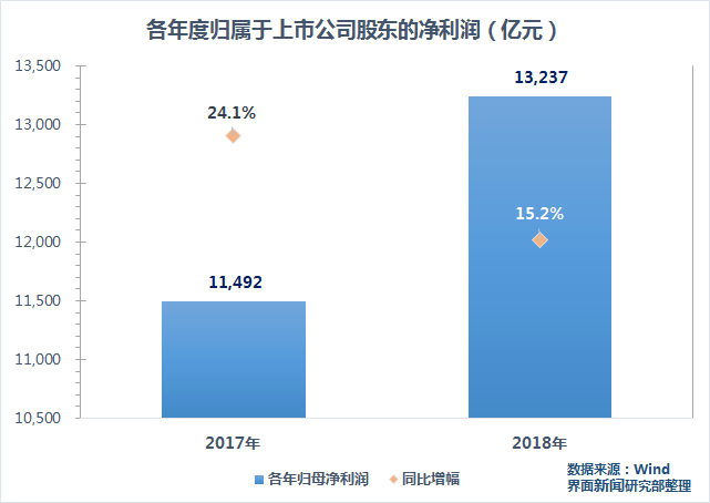 以拥有完整2017年同期数据的2650家上市公司为基准,2018年前三季度A股归母净利润为13,237亿元,同比增长15.2%,去年同期实现净利润11,492亿元,增速为24.1%。
